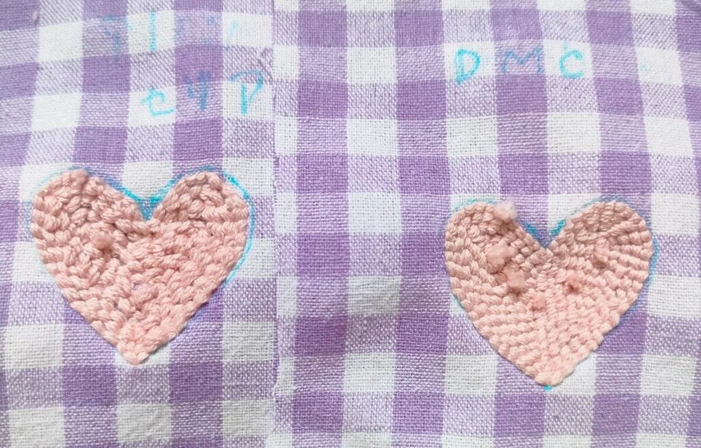 模様がはっきり出やすいようにハートの谷を深めにして、密度を濃く刺すように頑張りました。